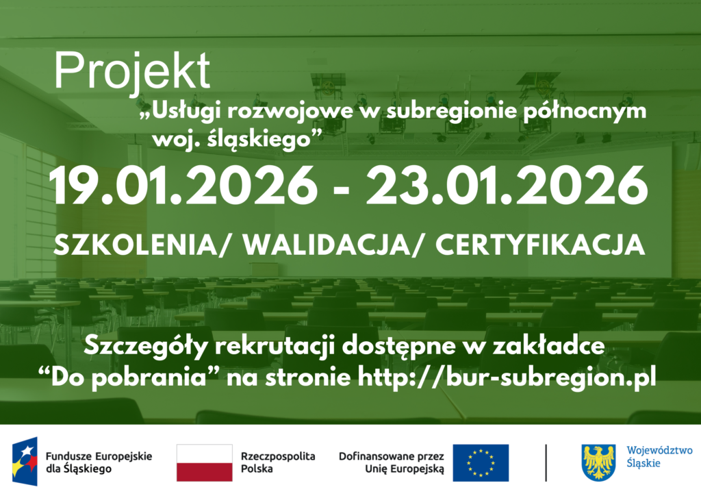 Już 19 stycznia 2026 r. rusza nabór w projekcie „Usługi rozwojowe w subregionie północnym woj. śląskiego”. Nabór dedykowany będzie szkoleniom/walidacji/certyfikacji. Z procesem rekrutacji zapoznać się można w zakładce „Do pobrania” na stronie internetowej projektu
