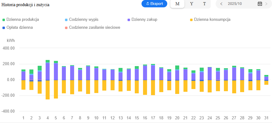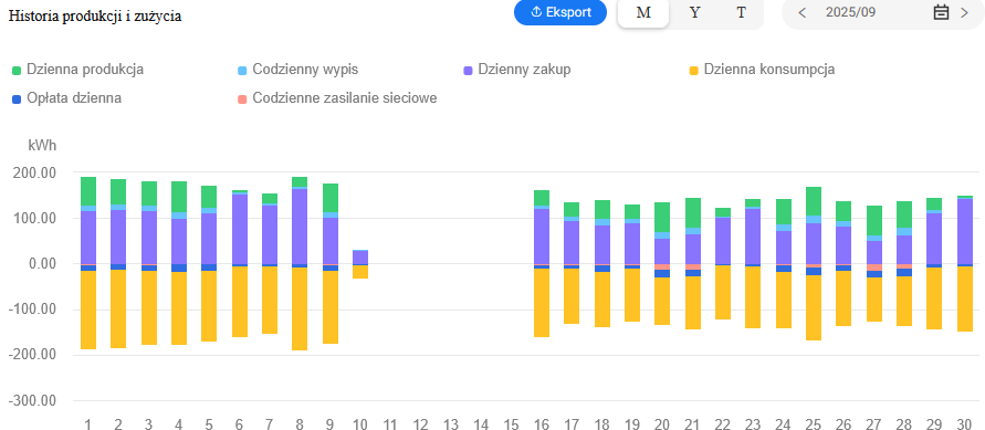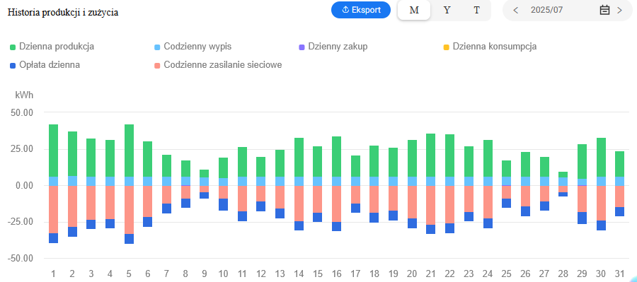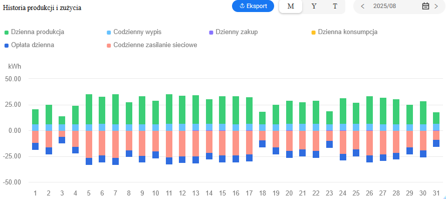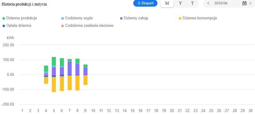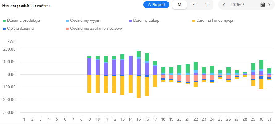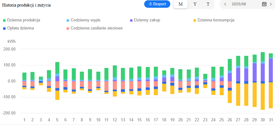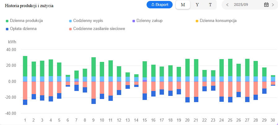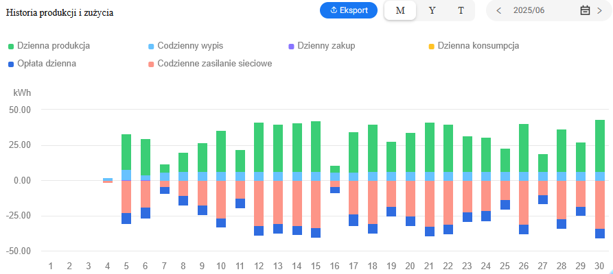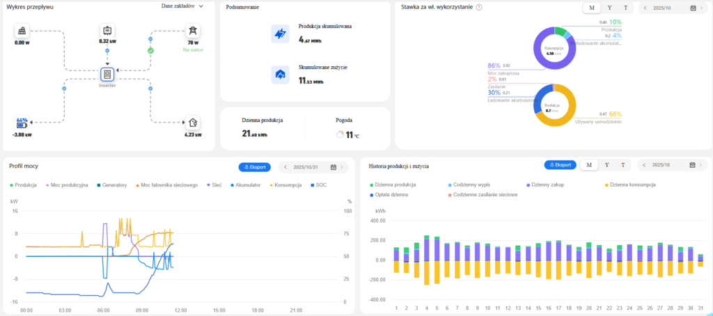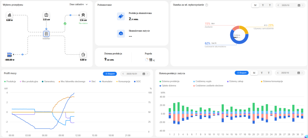 Zamontowany został system monitoringu działania instalacji, który zapewnia możliwość stałego podglądu danych z instalacji m.in. ilość wyprodukowanej i zmagazynowanej energii.